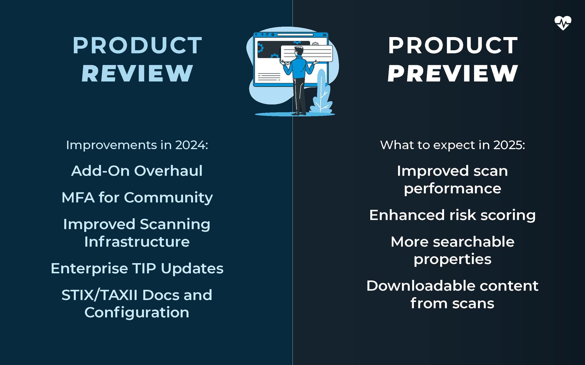 In 2024, our team released improvements to our free add-on, introduced MFA to all users, improved our scanning infrastructure, updated our STIX/TAXII docs, and a bunch more in the backend. Up next, you can expect improvements to scanning performance, risk scoring, searchable properties, and downloadable content from scans.