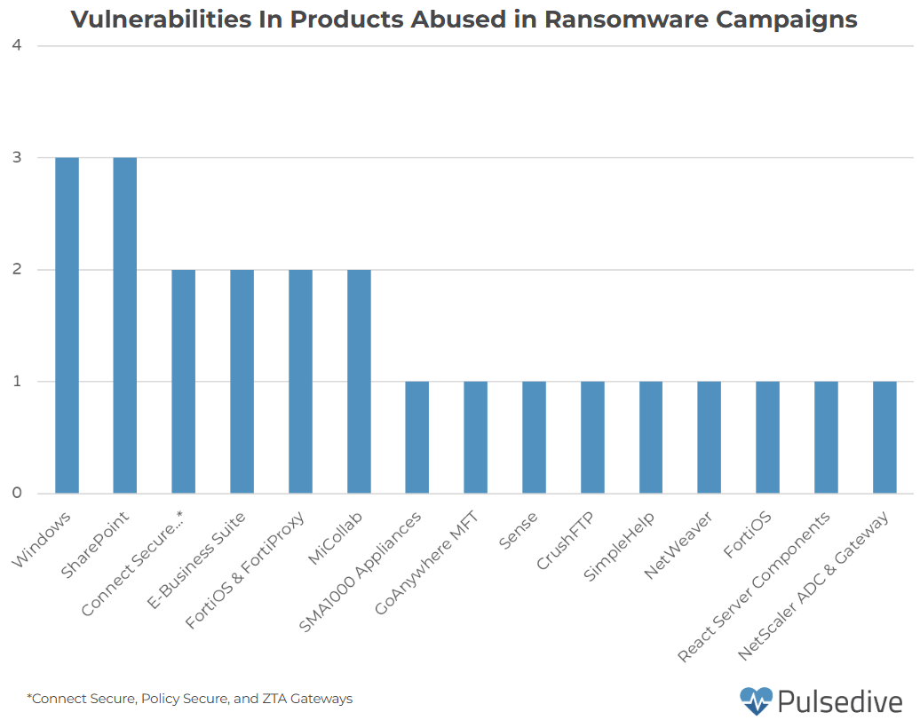 Of the 236 vulnerabilities added to KEV in 2025, 23 have been used in ransomware campaigns. These vulnerabilities include those in edge devices such as SMA100, NetScaler ADC, and Connect Secure. Other public-facing devices, such as Oracle E-Business Suite, SharePoint, and CrushFTP, were also targeted in ransomware campaigns.