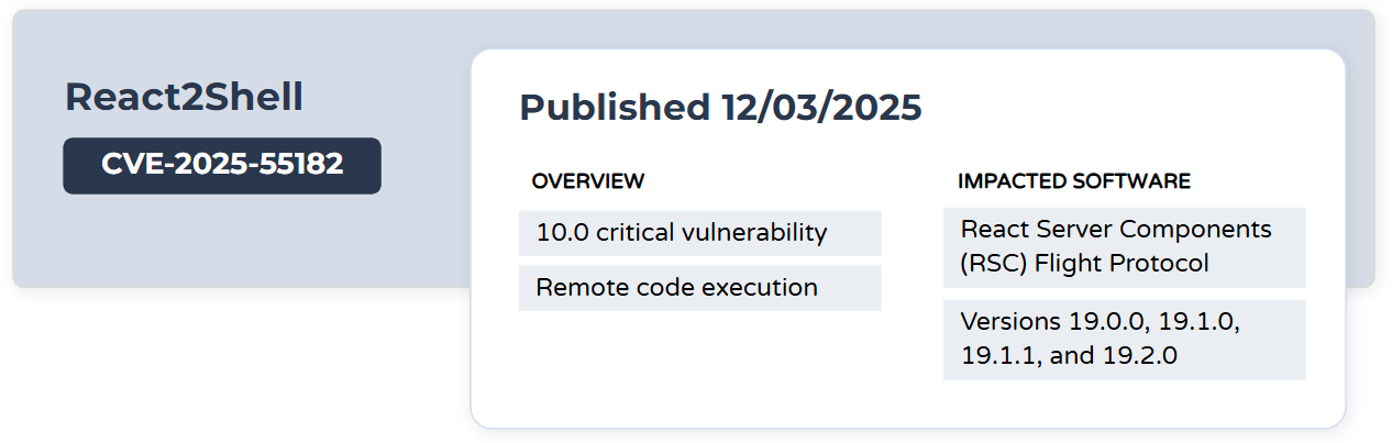 React2Shell (CVE-2025-55182) is a critical unauthenticated remote code execution vulnerability in the React Server Components (RSC) Flight protocol. Successful exploitation of the vulnerability will result in remote code execution. Threat actors have used this vulnerability to check for vulnerable components, conduct reconnaissance, and deploy additional payloads. Threat actors have used this vulnerability to deploy coinminers, such as XMRig, on vulnerable instances.