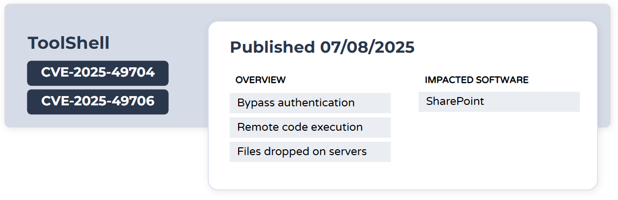 ToolShell is a name given to two SharePoint vulnerabilities that allow a threat actor to bypass authentication (CVE-2025-49704) and remotely execute code by writing files to the server (CVE-2025-49706). CVE-2025-53770 and CVE-2025-53771 are CVEs assigned to subsequent vulnerabilities that bypassed patches for CVE-2025-49704 and CVE-2025-49706. Successful exploitation of these vulnerabilities led to files being dropped on the SharePoint servers.