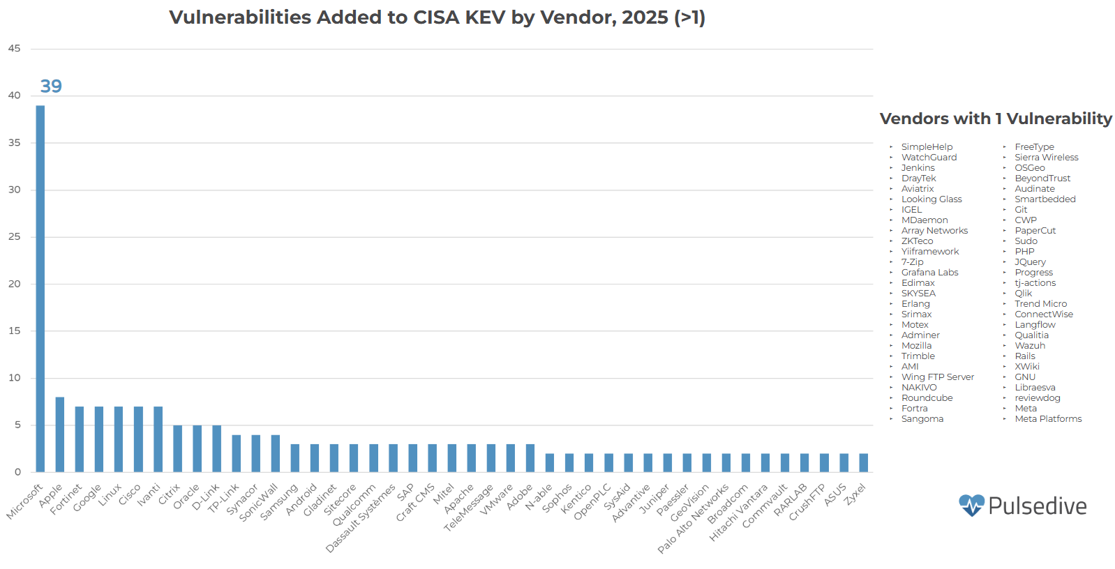 CISA’s Known Exploited Vulnerabilities (KEV) Catalog was used to collect statistics about exploited vulnerabilities in 2025. CISA has added 236 vulnerabilities to the catalog in 2025. The data used in the graphs below is accurate as of December 14th, 2025, at 12:17:58 EST.