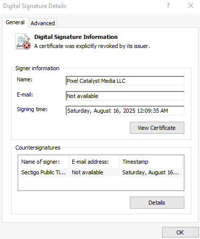 The operators behind EvilAI disguise their malware as productivity tooling that uses AI to enhance user experience. These malicious applications claim to provide productivity functionality, such as merging PDFs, and are signed with valid digital signatures. These malicious applications were distributed through malicious advertisements, SEO manipulations, and social media links.