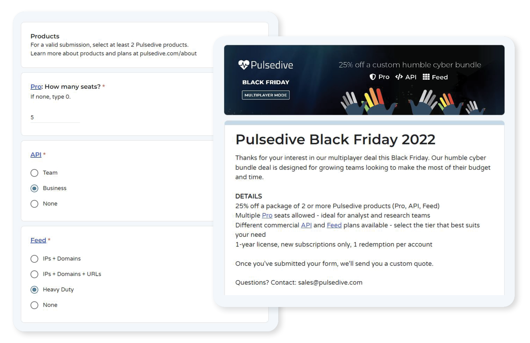 Get a whopping 25% off an annual bundle of 2 or more Pulsedive products by submitting this form before 11/30/2022.