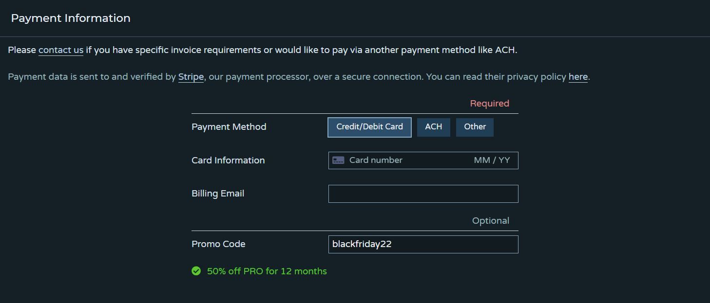 I don't have an account? You can use the BlackFriday22 code when you visit https://pulsedive.com/purchase/pro?code=BLACKFRIDAY22. After completing your purchase, we will send a registration link to create your account. Keep an eye on your emails. If you already have a free account, make sure you're logged in to upgrade.