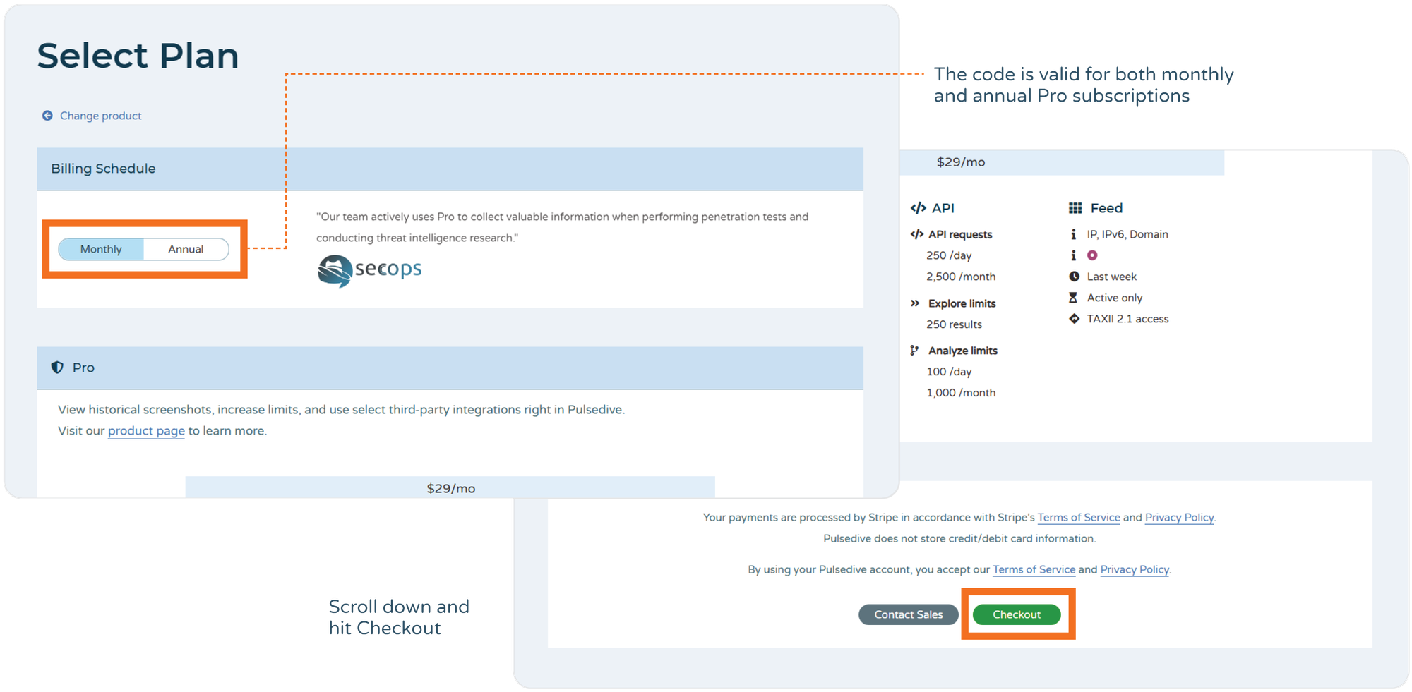 - How to Redeem: On Pulsedive's purchase page, select a monthly or annual Pro plan, hit Checkout.