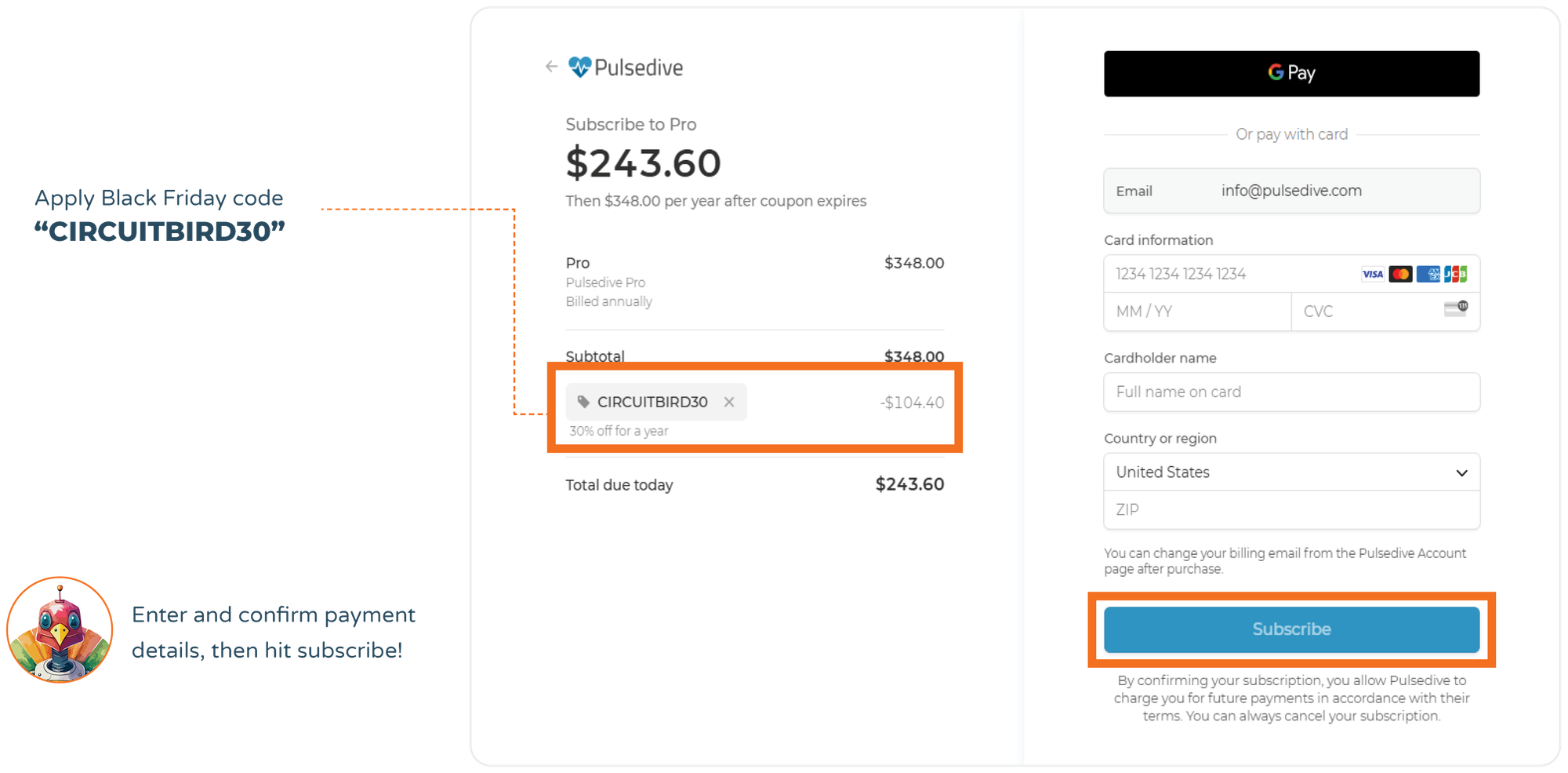 - On the following page, enter code: CIRCUITBIRD30, fill in payment information, then hit Subscribe.