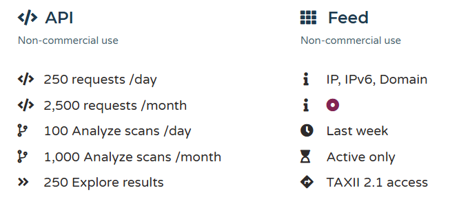 Designed with security analysts, threat researchers, incident responders, and cyber enthusiasts in mind, Pro offers even more of the data that Pulsedive users love in the same intuitive interface. Features include third party enrichment integrations, historical screenshots, higher API limits, and a critical risk IPs+Domains Blocklist Feed.