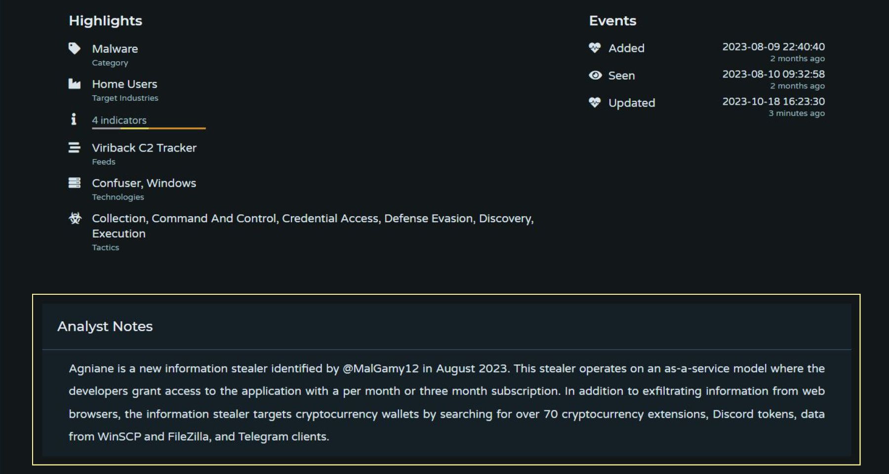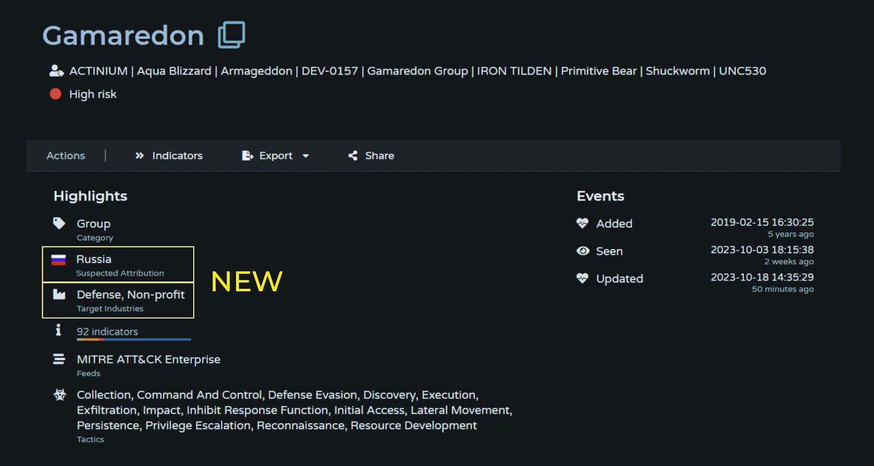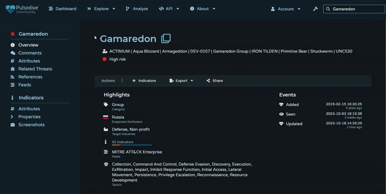 Pulsedive's Highlights section at the top of every threat page now includes:
