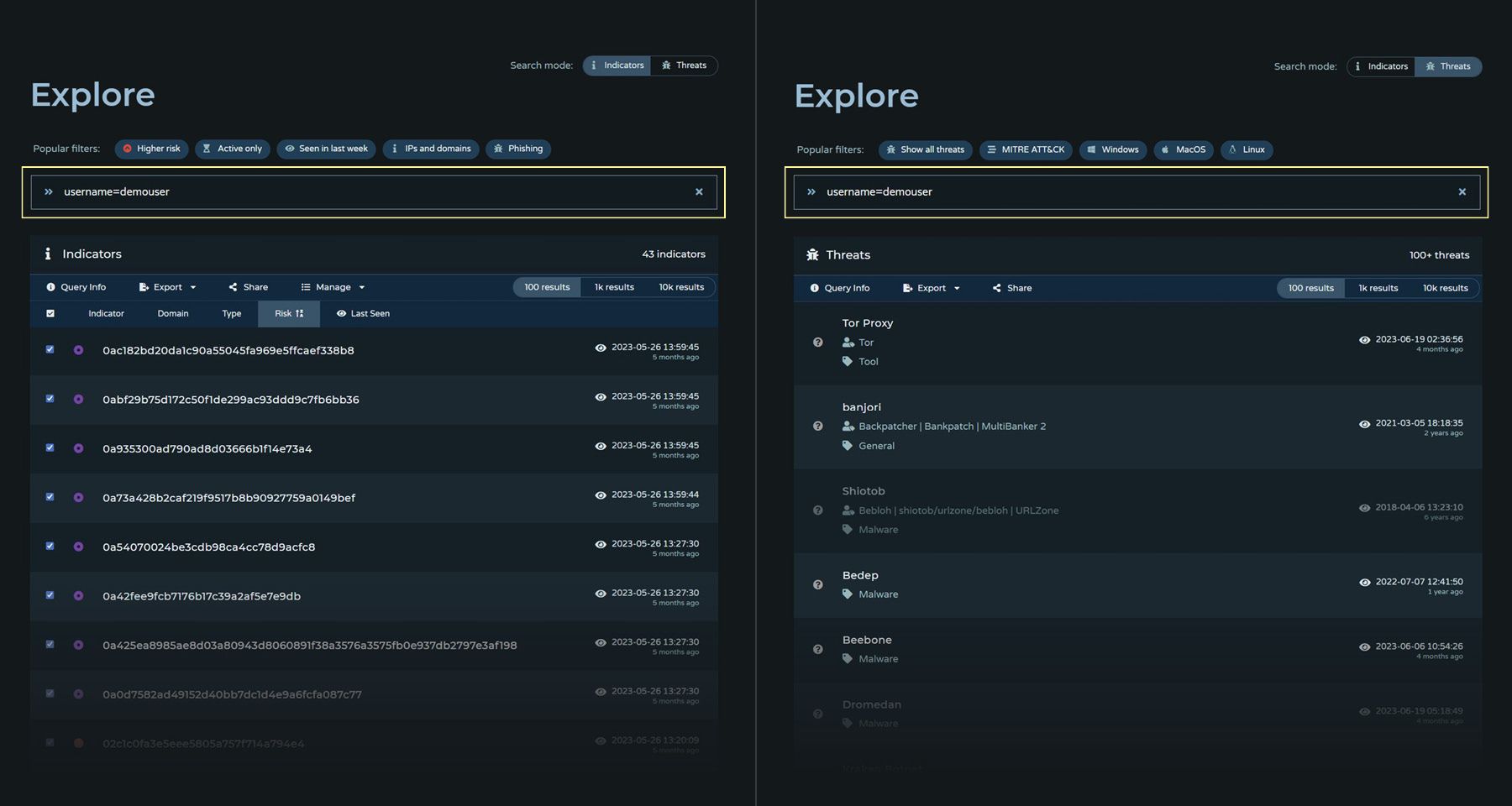 Admins can search for IOC and threat submissions by username in Explore using the "username=" search term to simplify tracking, editing, and sharing.