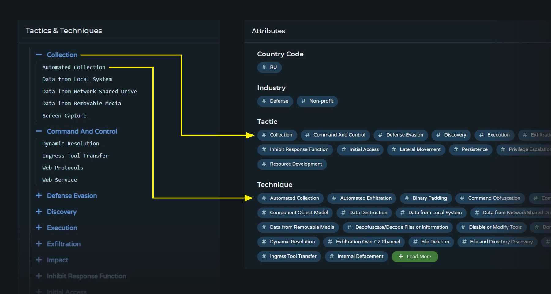 The previous Tactics & Techniques matrix is now higher up on the page for quicker access, with a separate Attributes section containing Tactic and Technique attribute tags. These two formats support different research needs: 1) navigating attack progression with all techniques and sub-techniques nested under their respective tactics, and 2) broken out in alphabetical order for focused search and pivoting.