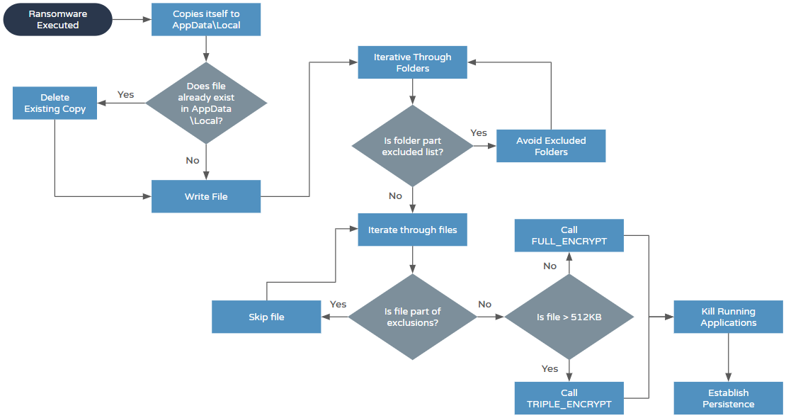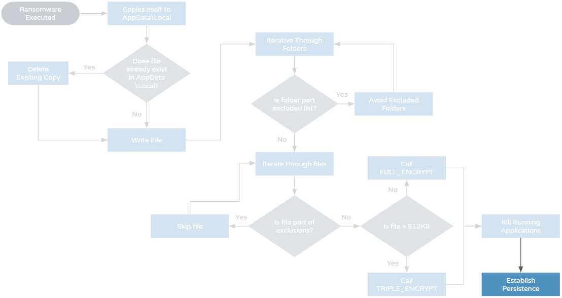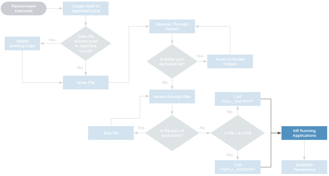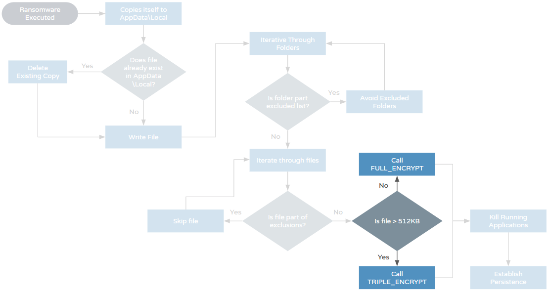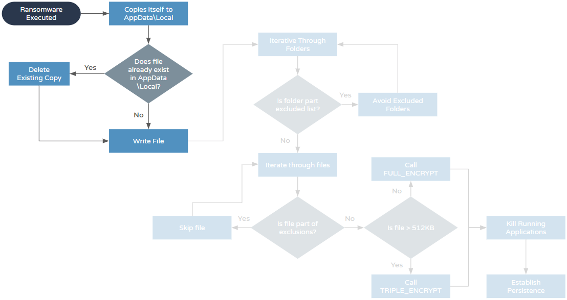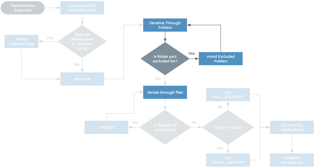 Once the ransomware has been copied into AppData\Local it iterates through all available drives on the device. During this stage the ransomware is discovering what folders are accessible on the device. This is the precursor to encryption. The malware also contains several exclusions for folders that the malware does not target.