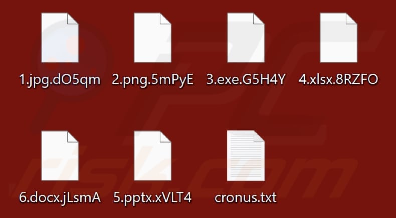 When Cronus encrypts files, it appends a random 5 character alphanumeric file extension to each encrypted file. This differs from some other ransomware variants which use the same file extension for all encrypted files. The table shows examples of the ransom file extensions added to files when the sample was run in a sandbox.